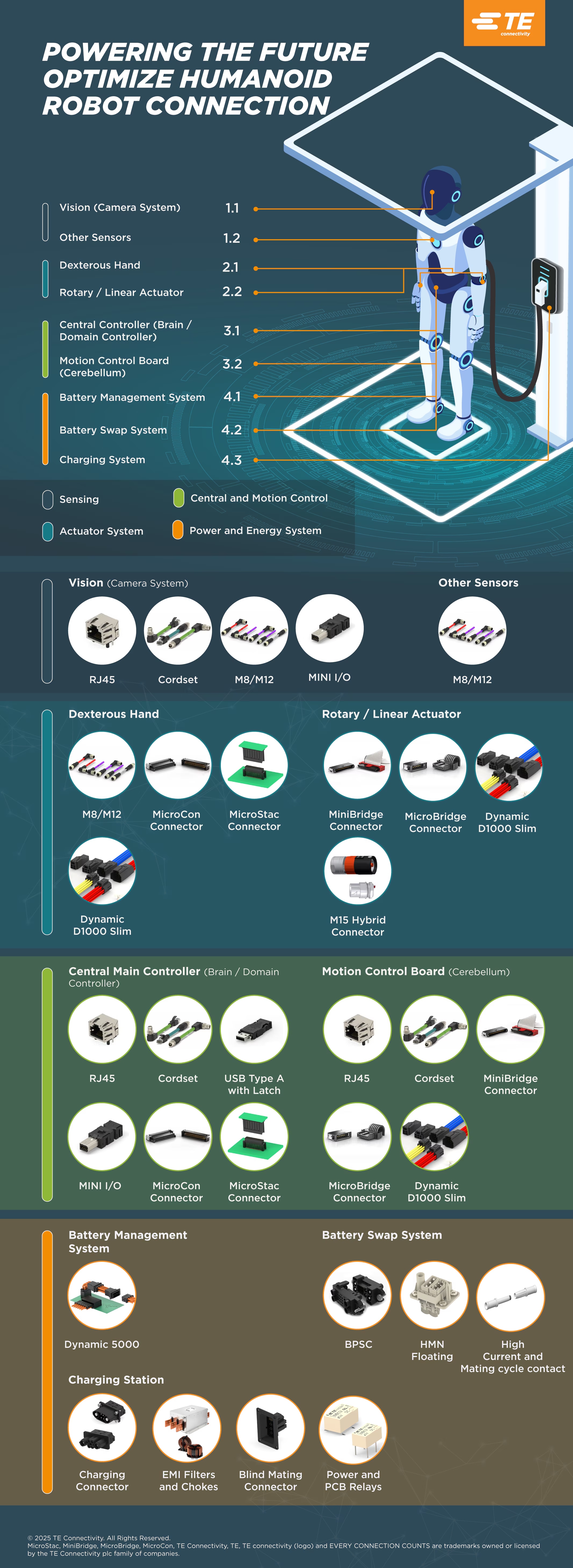 TE Connectivity's (TE) Humanoid Robots feature interconnect and sensor solutions designed to enable smarter collaboration between people and machines. TE manufactures flexible and high-performance components crucial for the advancement of humanoid robots. The comprehensive interconnect portfolio encompasses power, signal, data, and hybrid connectors, as well as electronic components such as power and signal relays, EMI filters and chokes, contactors, and sensors. These products from TE help engineers create humanoid robots that support human potential, from safe, reliable performance to precise motion.